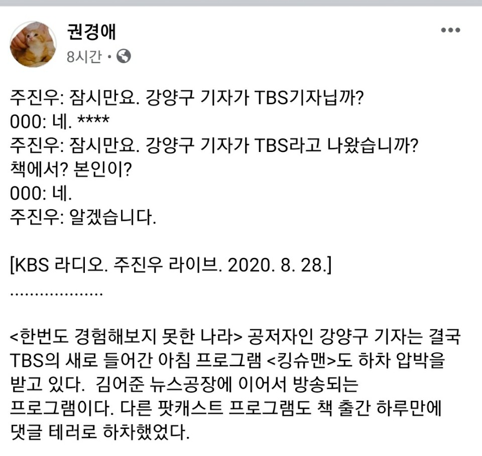 권경애 변호사가 TBS의 강양구 기자 하차 압박 의혹을 제기해 논란이 크게 번지고 있습니다. 권경애 변호사는 최근 화제가 된 ‘한번도 경험해보지 못한 나라’의 공동저자 입니다. 강양구 기자도 이 책을 함께 집필했습니다.
