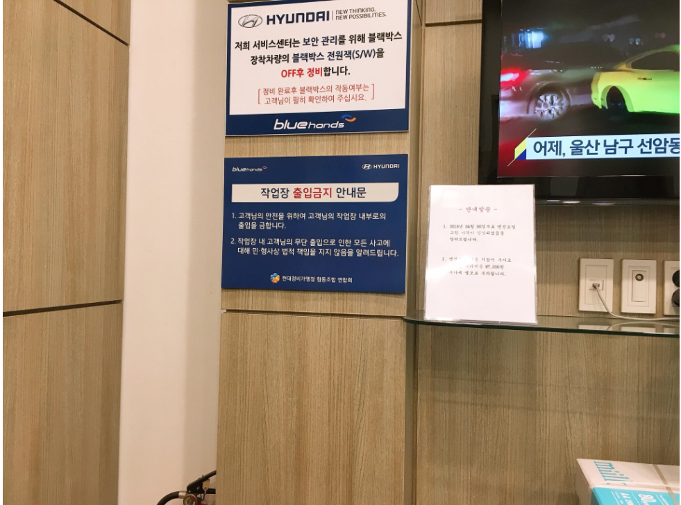 이 사업장은 현대블루핸즈인데요 정확한 위치는 파악되지 않았습니다. 안내문구는 "저희 서비스센터는 보안관리를 위해 블랙박스 장착차량의 블랙박스 전원잭을 끈(OFF)한 뒤 정비합니다"입니다.