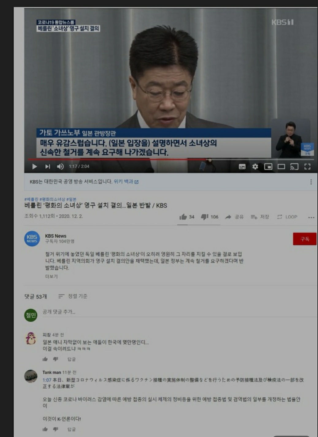 KBS는 2일 뉴스에서 베를린 ‘평화의 소녀상’ 영구 설치 결의… 일본 반발이라는 제하의 리포트를 냈습니다. 문제는 가토 가쓰노부 일본 관방장관의 발언이었습니다. KBS는 가토 관방장관의 발언을 “매우 유감스럽습니다. (일본 입장을) 설명하면서 소녀상의 신속한 철거를 계속 요구해나가겠습니다.”라고 소개했습니다. 하지만 이는 실제 발언과 전혀 다른 자막이었습니다.