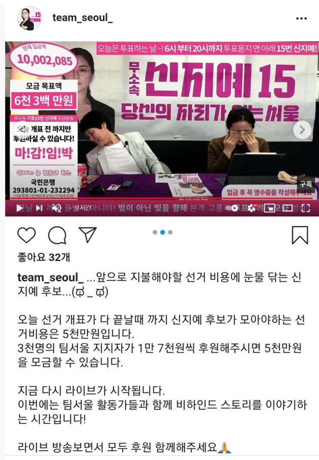 이분은 왜 울고 있을까요? 인스타그램 라이브방송에서 신지예 후보캠프는 선거비용 5000만원을 3000명의 팀 지지자가 1만7000원씩 선거비용을 보전해 달라며 국민은행 계좌번호까지 띄웠습니다.