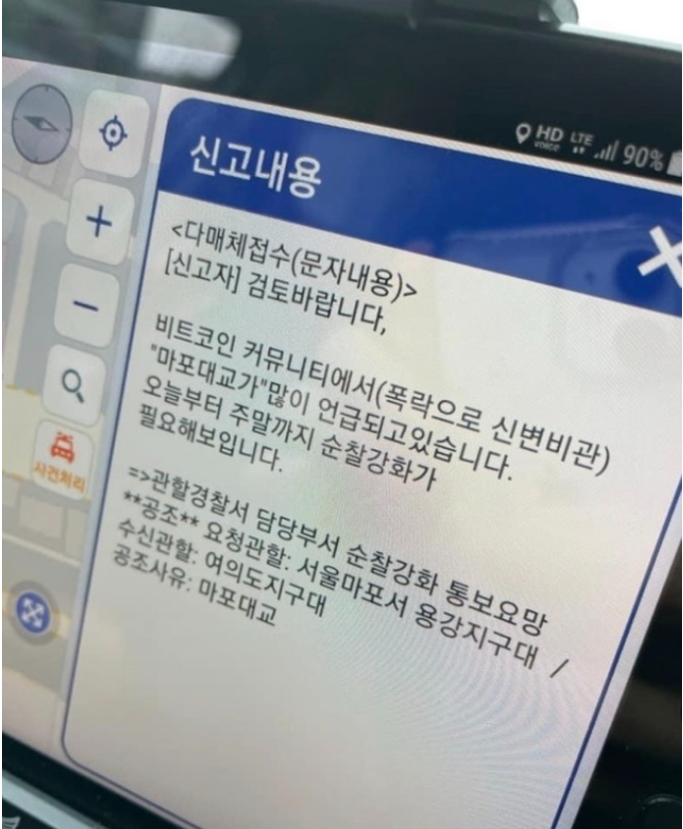 문자의 내용은 인터넷 비트코인 갤러리, 비트코인 커뮤니티 등에서 가격 대폭락으로 인한 신변비관으로 마포대교가 많이 언급되고 있다는 내용이었습니다.