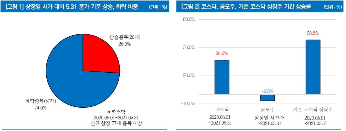 지난해 6월 1일부터 신규 상장된 코스닥 기업 77개의 시초가 대비 지난 5월 31일 종가 기준 수익률 평균 -6.8%라고 합니다.