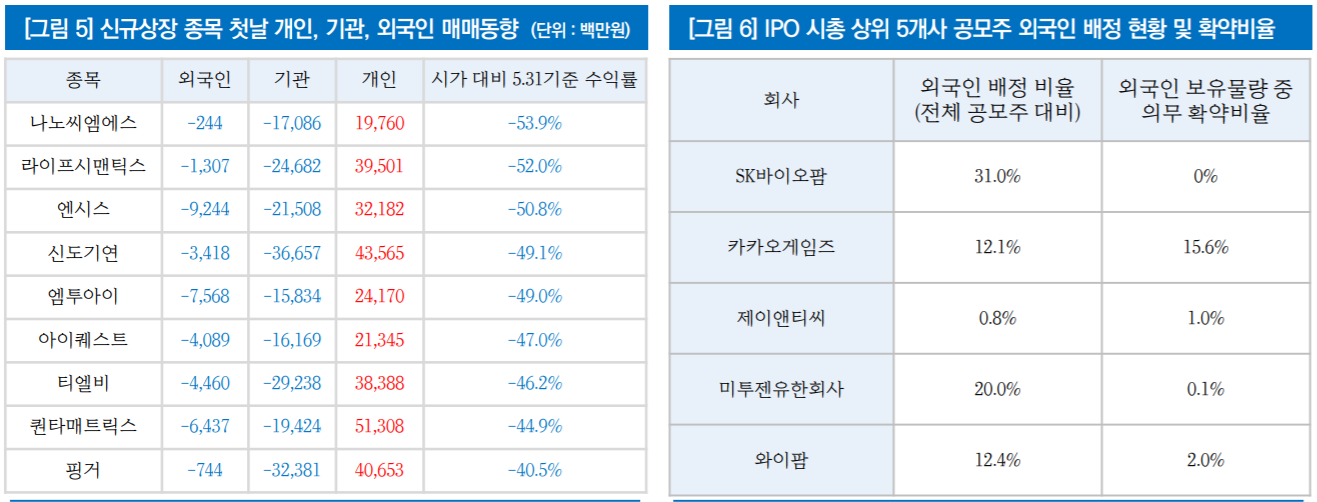 9개 종목 모두 외국인과 기관은 첫날 팔아치울 수 있는 최대치를 팔아치웠습니다. 물량은 개인이 떠받았는데 수익률은 모두 -40%대 이상이었습니다.