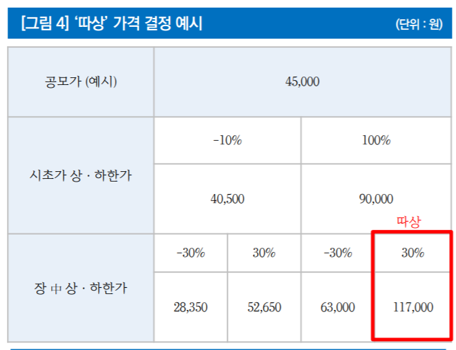 신규 상장주식의 시초가는 공모가 기준 -10% ~ +100% 범위 내 산정, 따라서 공모가 대비 최대 2배 높은 가격에서 형성 가능.