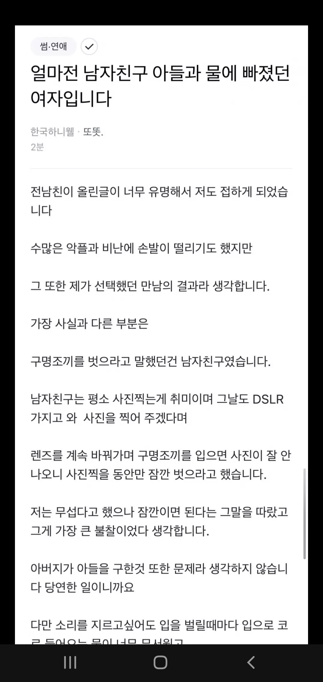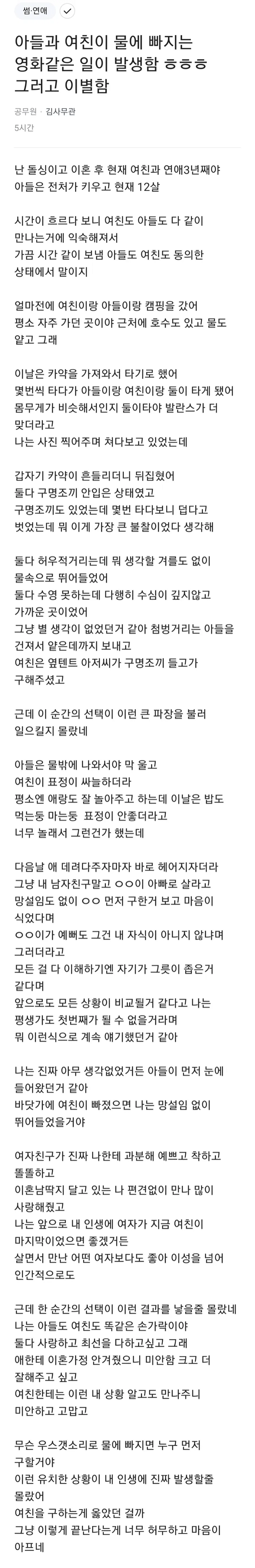 우선 글쓴이는 수심이 깊지 않았고, 아무 생각 없이 아들을 먼저 구했는데.
