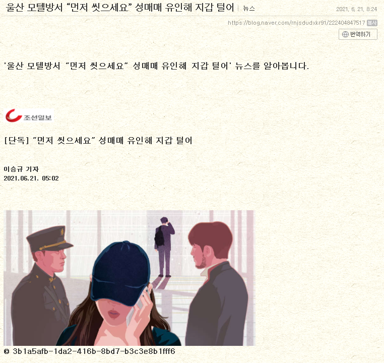 현재 위 일러스트는 논란을 예상한 조선일보에서 교체를 했는데요... 이 기사는 지난 6월 21일 송고된 기사로 이미 블로그 등으로 일러스트와 함께 기사 전체가 공유된 기록이 있습니다.