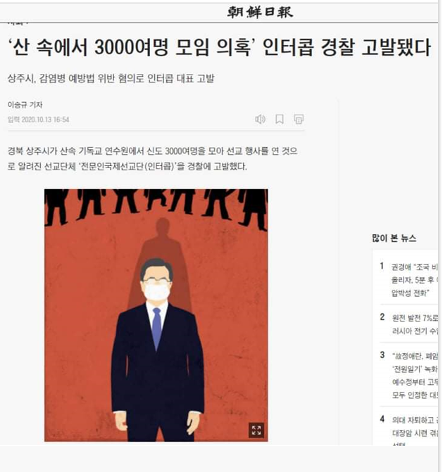 제하의 기사를 올렸습니다. 인터콥은 전문인국제선교단으로 코로나19 시국에 집회를 열어 감염병의 예방 및 관리에 관한 법률 위반 혐의로 경찰에 고발된 바 있습니다.