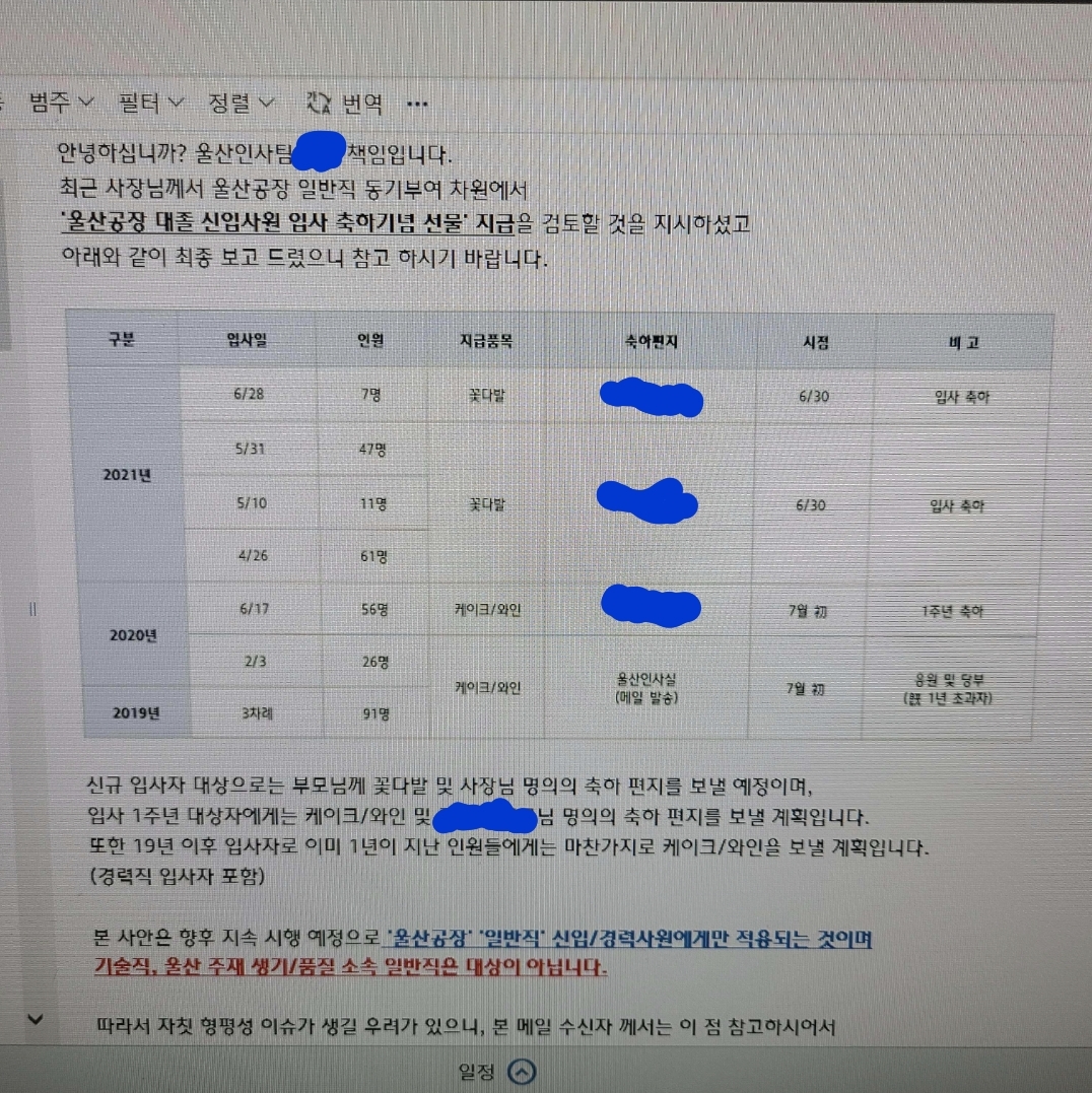 울산공장 일반직 신입직원을 대상으로 입사축하기념선물을 송부했습니다.