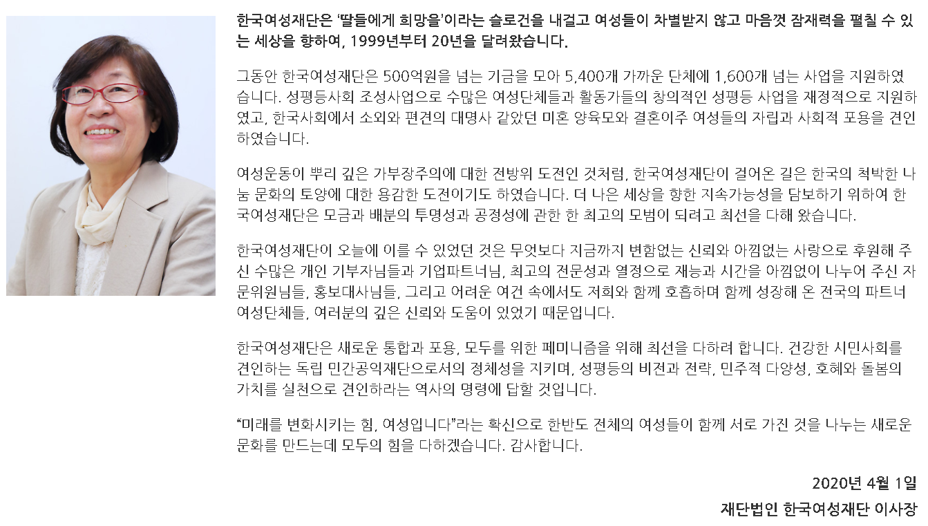 "한국여성재단은 새로운 통합과 포용, 모두를 위한 페미니즘을 위해 최선을 다하려 합니다."