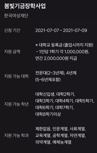지원금액은 1인당 1학기 1백만원씩 연간 200만원을 지원합니다. 지원가능대학은 전문대와 4년제 모두 포괄합니다. 지원가능학년과 가능학과도 전체 학과 학년을 포괄했습니다.