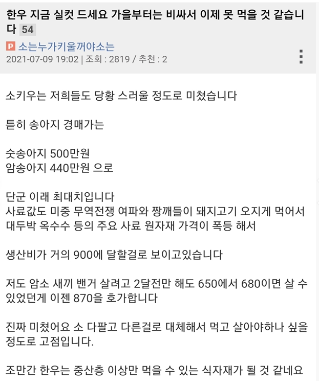 이 글쓴이 글을 보면 사료 가격도 대두박 옥수수 등 원자재 가격이 폭등해 생산비만 900만원에 육박할 것으로 예측했습니다.