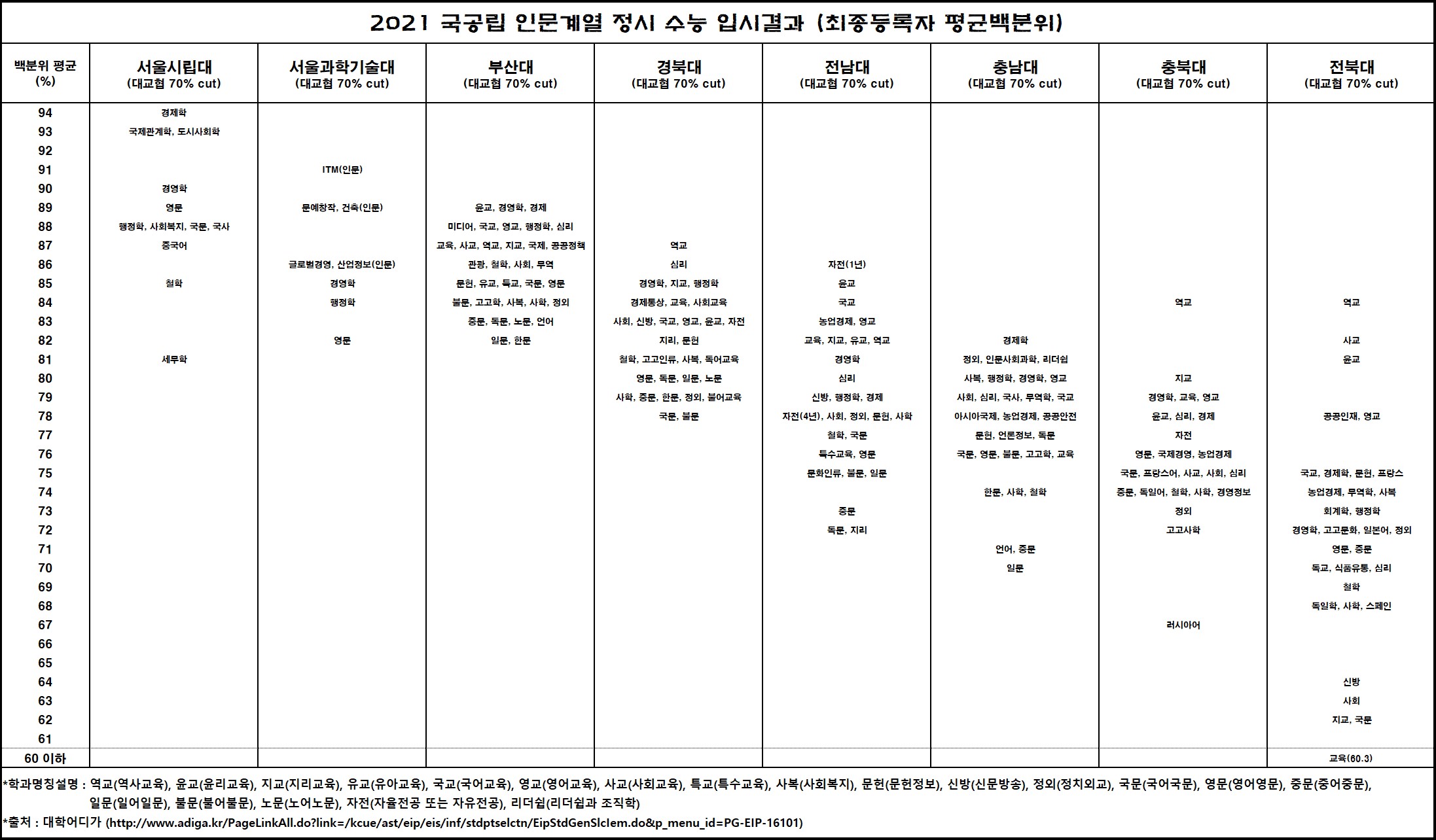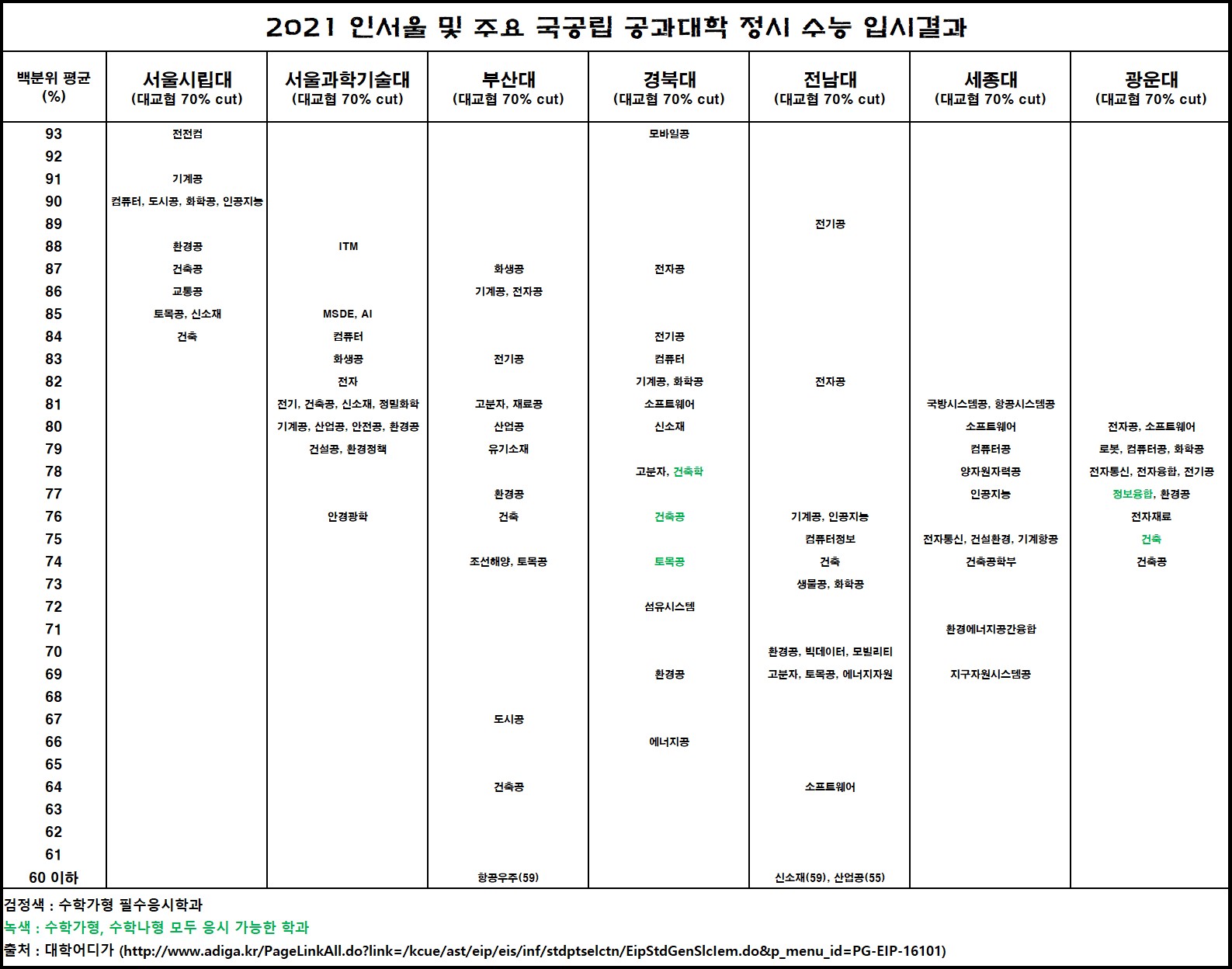 출처는 대학어디가에서 한국대학교육협의회 공개 상위 70% 커트라인 평균 백분위를 기준으로 작성한 자료입니다.