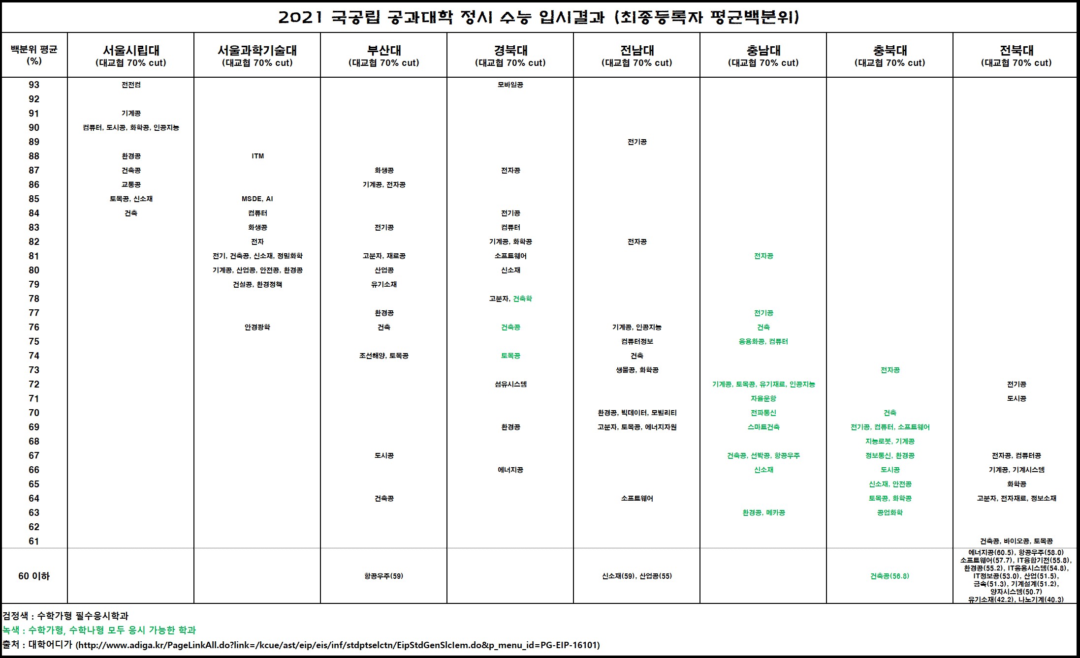 2021년 인서울을 포함한 국공립대학의 정시 수능 입시결과를 공개합니다.
