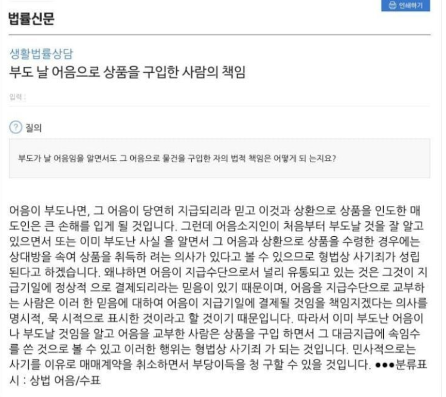 어음이 부도나면, 즉 머지포인트가 부도나면 그 어음이 당연히 지급되리라 믿고 이것과 상환으로 상품을 인도한 매도인은 큰 손해(자영업자 점주)를 입게 될 것입니다.