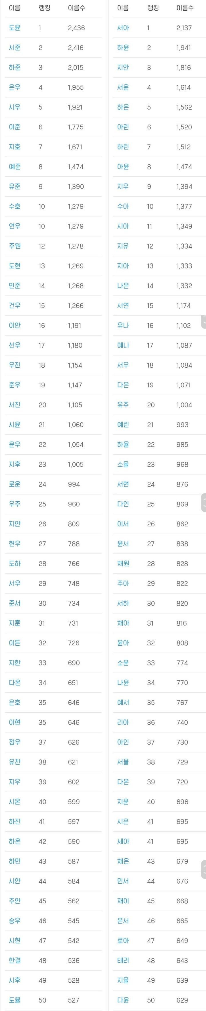 남아는 도윤 서준 하준 여아는 서아 하윤 지안이 1~3위를 차지했습니다.