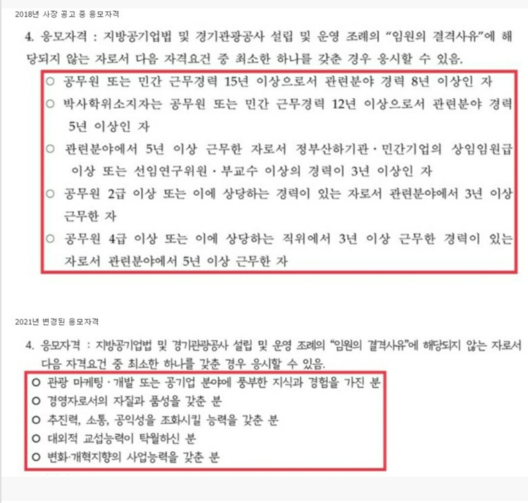 하지만 올해 황교익 씨가 내정된 경기관광공사의 변경된 응모자격을 보면 정량적 요소가 모두 제거됐습니다.