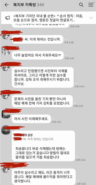 기자단의 반응은 예상대로 였습니다. 위 채팅 목록을 보더라도, "아무리 실수라고 해도 이건 충격이 너무 큽니다. 해당 매체에 불이익을 줘야합니다," "기분이 안 좋다." ,"무슨 짓입니까." "해당 기자와 해당매체의 기자단 퇴출을 요청합니다."