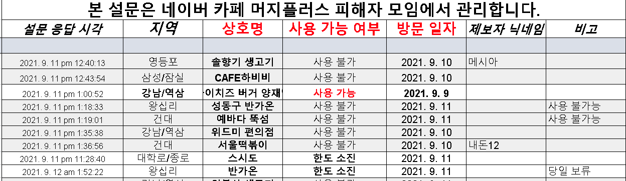 카페 회원분들은 설문 응답 시각, 지역, 상호명, 사용 가능 여부, 방문 일자, 제보자, 닉네임 등 촘촘하고 구체적인 데이터를 토대로 머지포인트 사용 가능 지역의 상호를 기재했습니다.