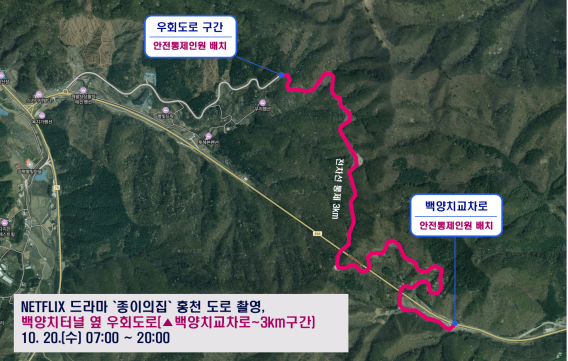 강원영상위원회는 도내 촬영 유치 지원 중인 NETFLIX 드라마 ‘종이의 집’의 촬영으로 20일(수) 홍천 백양치터널 옆 우회도로가 전면 통제된다고 밝혔습니다.