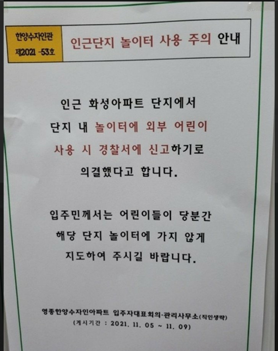인근 화성아파트 단지에서 단지 내 놀이터에서 외부 어린이 사용 시 경찰서에 신고하기로 의결했다고 합니다. 입주민께서는 어린이들이 당분간 해당 단지 놀이터에 가지 않게 지도하여 주시길 바랍니다.