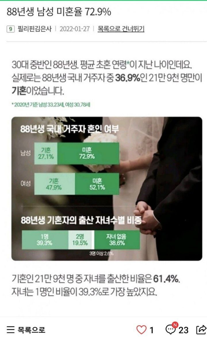 이 서른 다섯 남성의 72.9퍼센트가 장가를 가지않았다고 합니다. 70퍼센트가 넘는 확률은 이제 결혼하지 않은 사람이 일반적이고 흔하다는 뜻을 의미하지요. 오히려 기혼자임이 특이한 경우로 우리 사회는 받아들이고 있습니다.