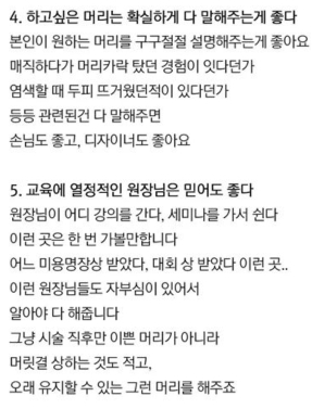이 분은 다양한 헤어디자이너가 근무하는 대형숍 보단, 1인 디자이너가 근무하는 1인숍을 추천했습니다. 1명이 끝까지 헤어스타일을 책임져준다는 이유 때문입니다.