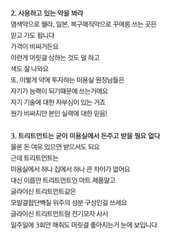 실제 미용실에서 근무했던 헤어디자이너, 미용사의 조언이니 신뢰도가 높습니다. 글쓴이가 실제 미용실에서 근무했는지 여부는 확인된 바 없습니다만 근무자가 아니라면 알 수없는 구체적인 조언들이 담겨있어 유용하게 사용할 수 있을 것으로 보입니다.