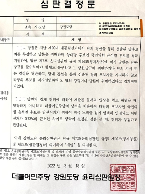 제명을 의결한 이유도 가관입니다. 더불어민주당 당적을 이용해 타당의 후보인 윤석열 후보를 위해 적극노력한점이 명백히 인정되고 이번 선거가 0.73%의 근소한 차이로 당락이 결정된 점을 볼 때 혐의가 무겁다고 강원도당은 밝혔습니다.