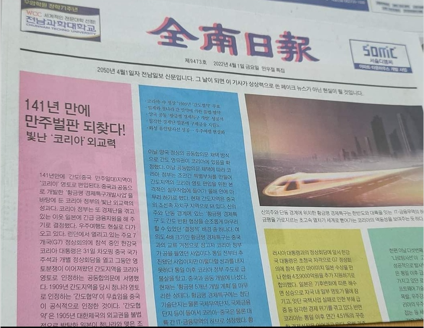 만우절이 선을 넘은 장난이나 분위기 파악을 하지 못하는 거짓말 등으로 눈살을 찌푸리게 하는 경우도 많습니다. 하지만, 이번 전남일보의 만우절 특집기사는 우리의 미래와 부강한 나라 건설이라는 희망적인 메시지를 담고 있다는 점에서 만우절 웃을 수 있는 이야깃거리가 됐습니다.