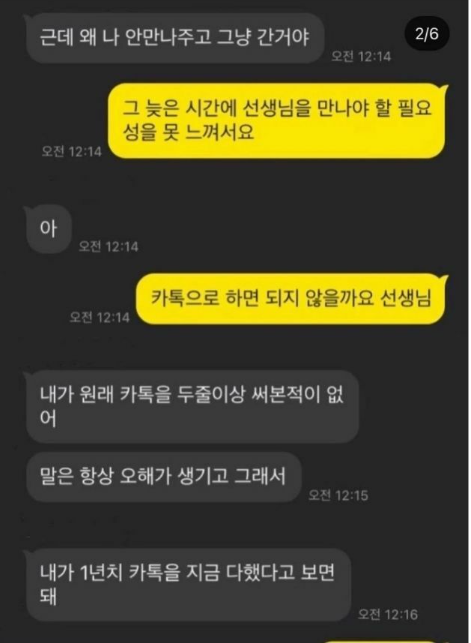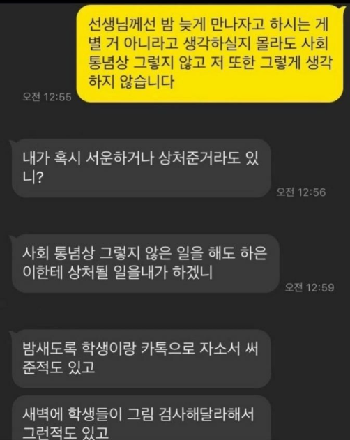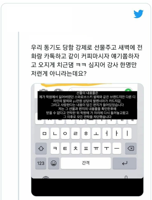 이 제보자는 트위터를 통해서 저 강사 한 명만 저렇게 치근댄 것이 아니다. 그리고 피해 학생이 이 외에 다른 학생도 강제로 선물주고 새벽에 전화랑 카톡을 하고 같이 커피마시자 얘기좀하자고 밝혔습니다.