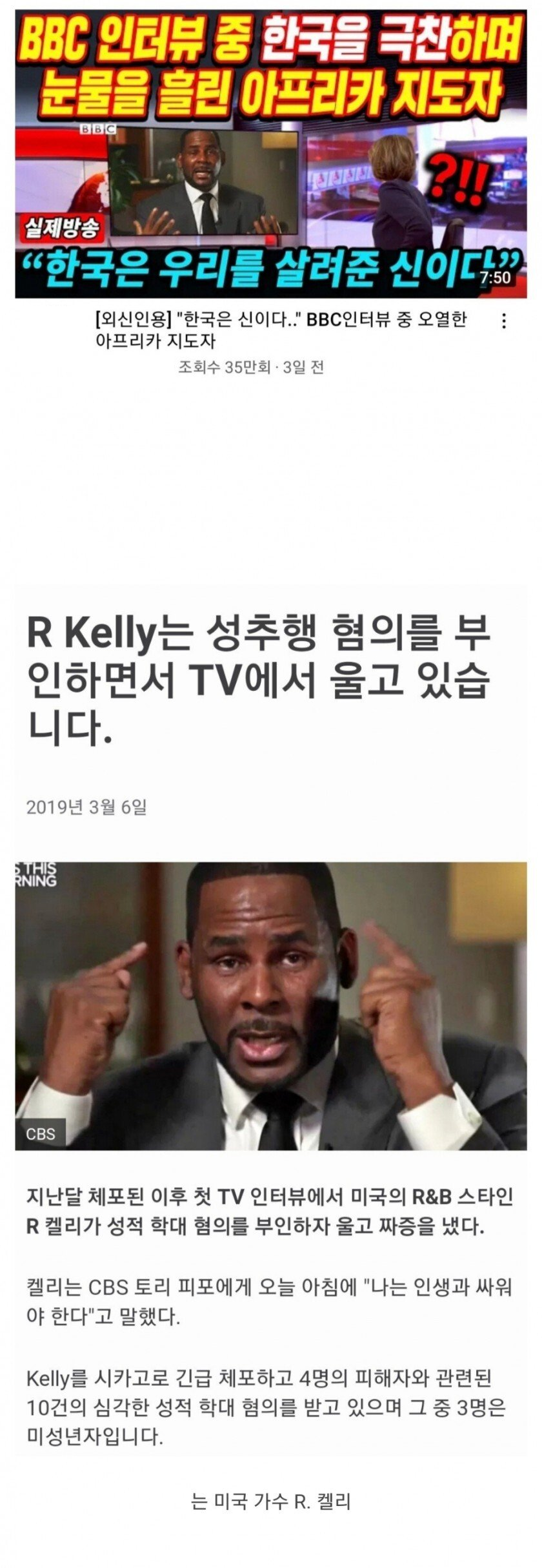한 국뽕 유튜브의 화면을 갈무리했습니다. 제목은 BBC 인터뷰 중 한국을 극찬하며 눈물을 흘린 아프리카 지도자 입니다.