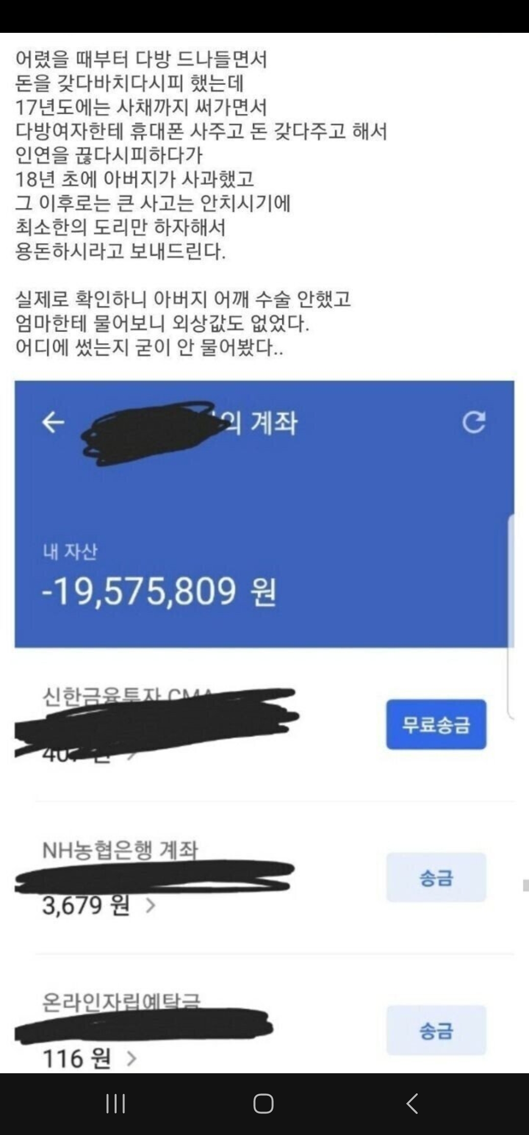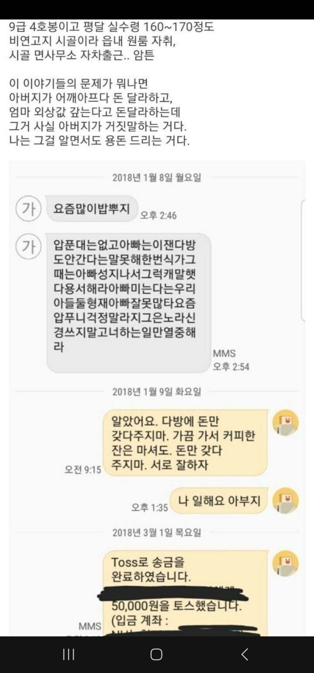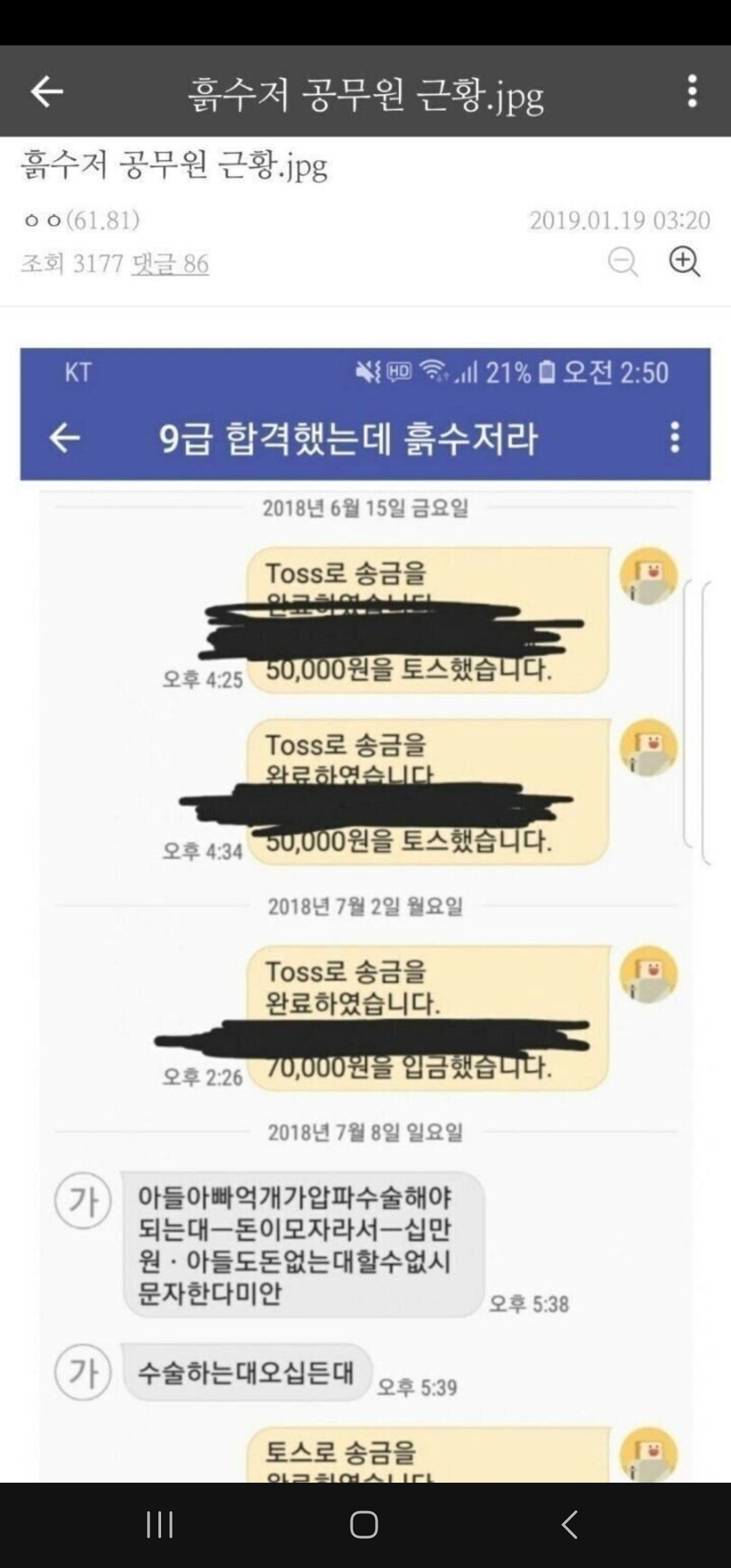 9급 공무원 합격 후에도 여전히 하지도 않은 어깨수술 등 각종 명목으로 아들에게 돈을 바랍니다.