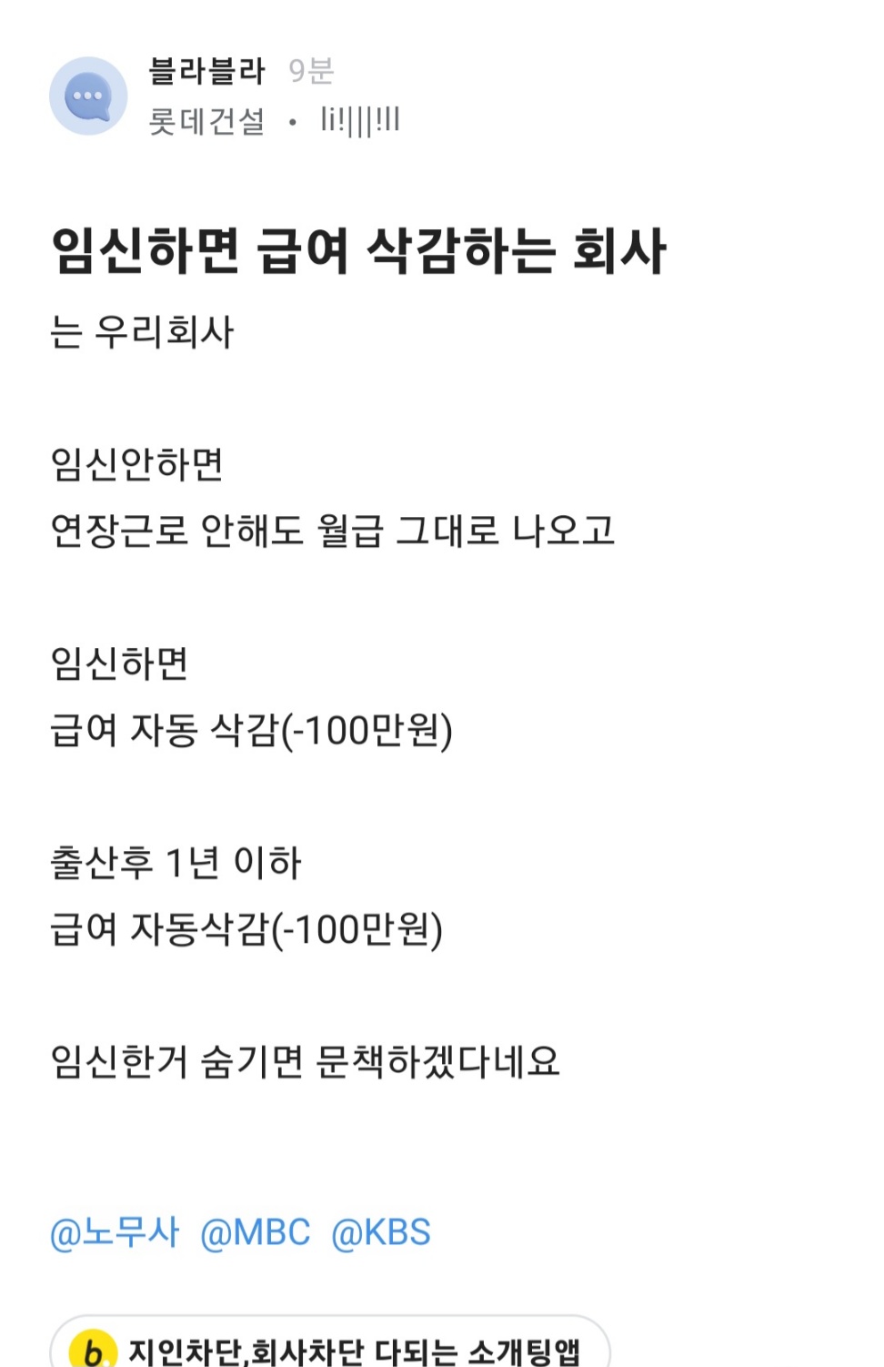 롯데건설 내부직원이 임신시 급여를 깎는다고 고백을 했습니다.