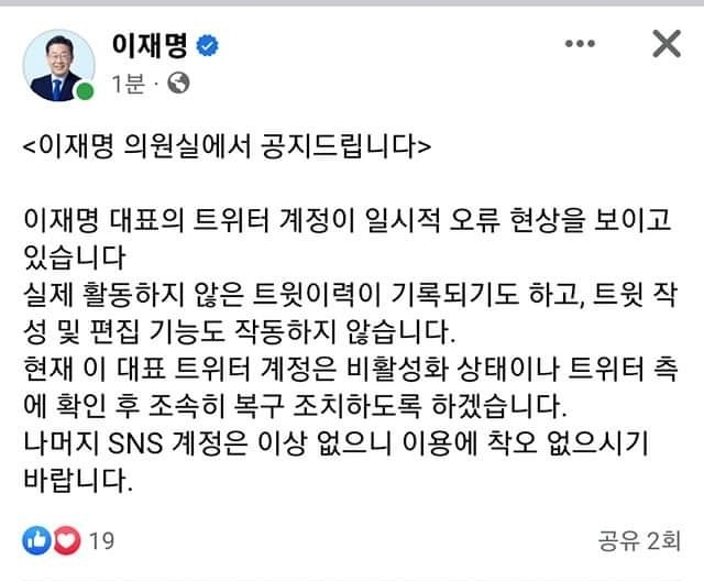 일단 이재명 대표는 일시적 오류라는 입장입니다. 실저로 활동하지않은 트윗이력이 기록됐다는 겁니다.