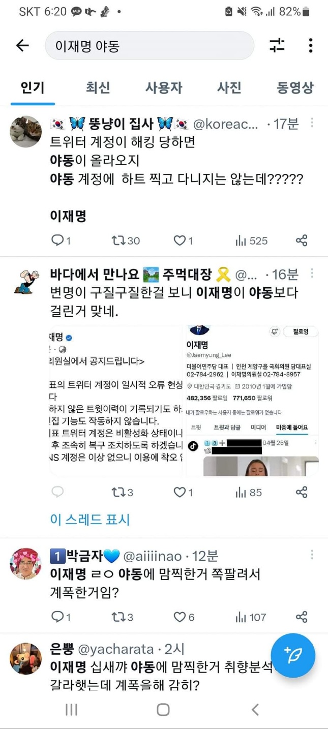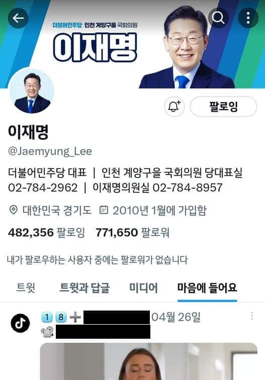 일단 이재명 대표 트위터는 야동 계정에 하트를 눌렀습니다.