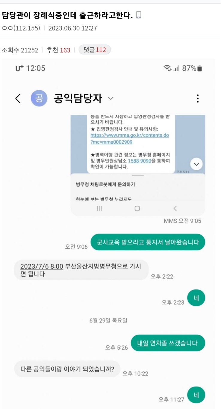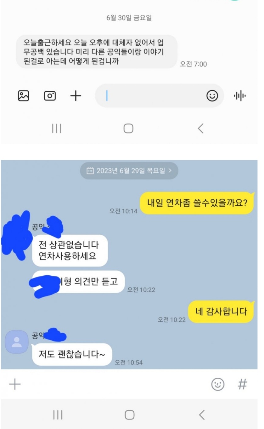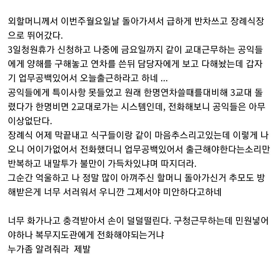 하물며 이 공익은 자신의 연차 휴가를 사용했습니다. 외할머니를 보냈다는 상실감에 사로잡혀 있는 이 공익근무요원에게 공익감독관이란 사람은 대체자 없어서 업무공백이 있다고 문자를 보냈습니다. 이 분은 큰 실수를 한 것입니다.