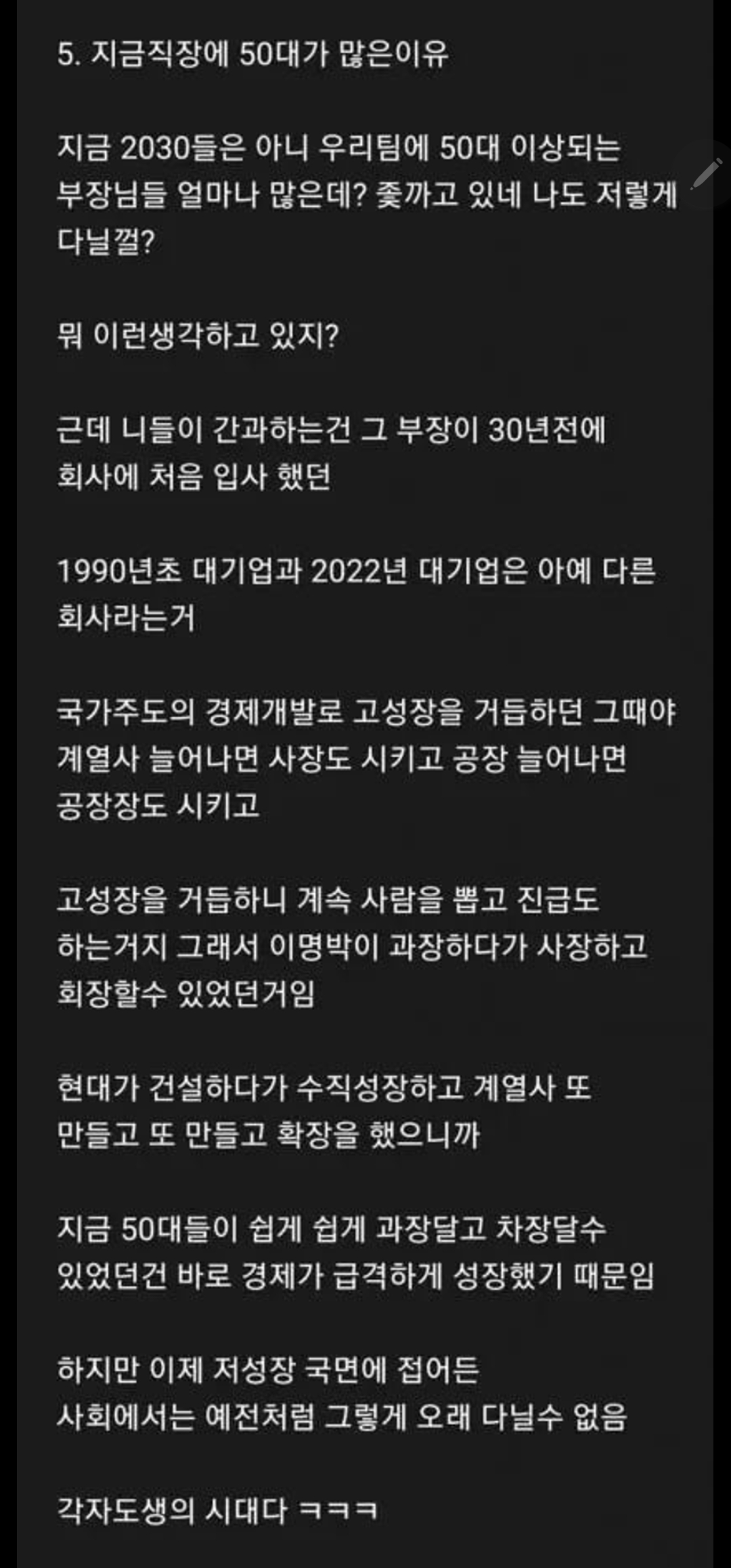5번도 극히 공감됩니다. 지금 부장급들 70년생 50대, 이분들은 그냥 운이좋았습니다. 정말 굶는게 일상이었던 50년대60년대생을 지나 70은 대학교를 갈 수있었지요. 대학졸업 후 신입사원시절엔 IMF 사태가 덮칩니다. 승진하면 다퉈봐야할 암묵적 경쟁자들이 모두 집에갑니다.