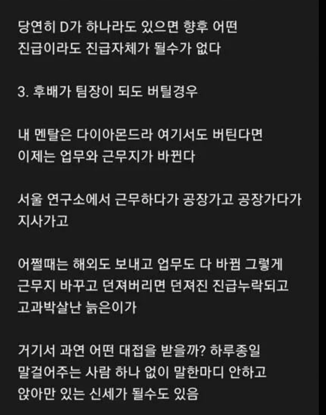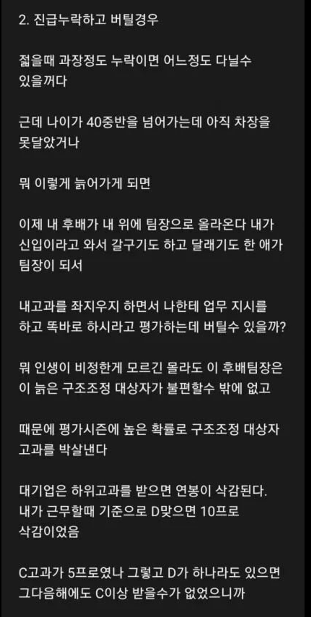 입사도 극히 어려운 대기업이지만 더 어려운 것은 대기업에서 정년까지 근무하는 게 아닐까 싶습니다. 역량있고 능력이 검증된 사람들이 즐비한데 직급과 연차가 쌓일수록 올라갈 직위는 적고, 승진하지 못한 직원은 회사입장에선 고비용 덩어리이기 때문이지요.