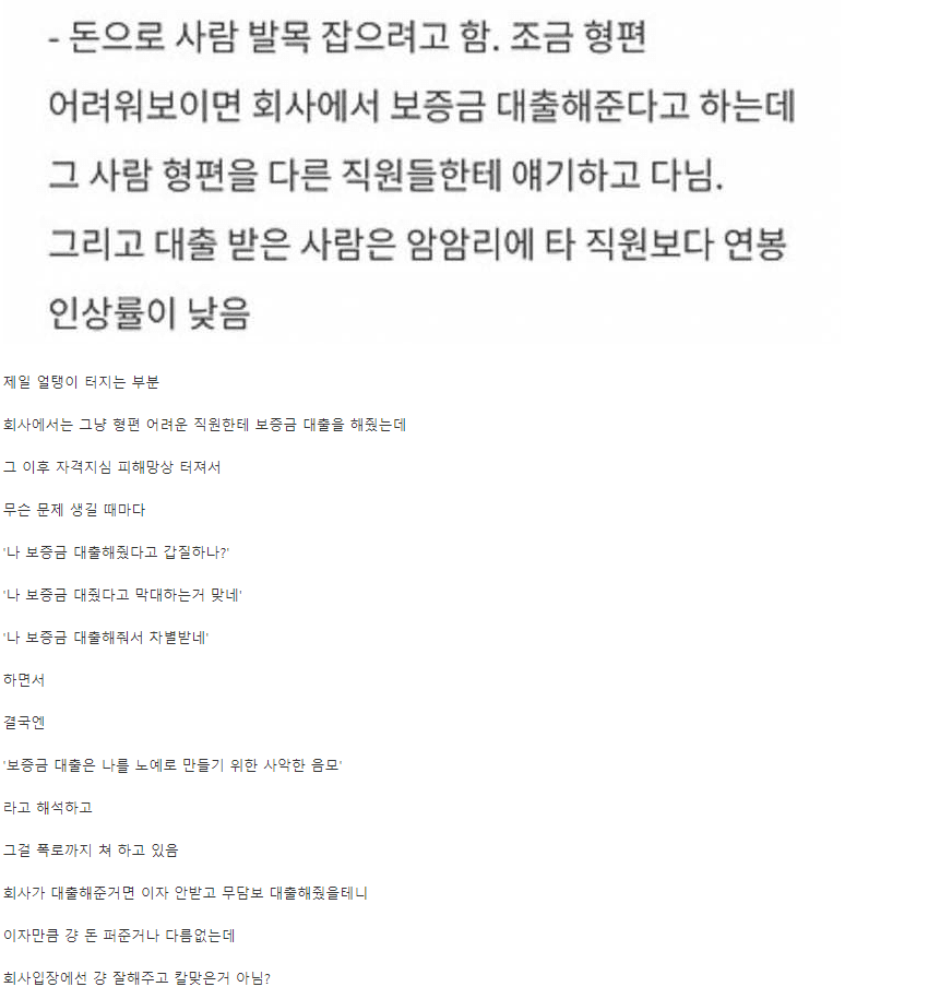 보증금 사건도 그렇습니다. 회사는 보증금 대출을 직원에게 지원해주고도 비판을 받았습니다. 폭로한 직원은 암암리에 임금인상률이 낮다고 했는데 이는 개인의 뇌피셜 그 이상, 이하도 아닙니다. 디시에서도 지적했듯 본인이 대출지원과 임금과의 명확한 증거자료를 확보하지도 않고 느낌만으로 회사에 타격을 가할 비판을 제기합니다.
