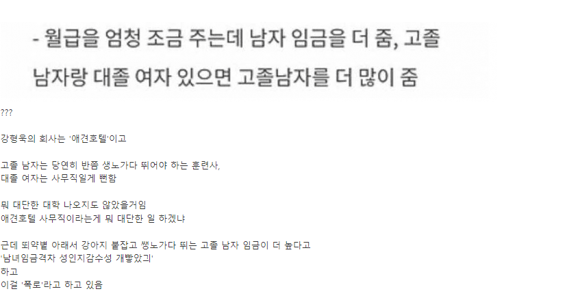 보듬컴퍼니에서도 훈련사는 실제 몸으로 일을 해 애견교정이란 회사 설립목적을 이뤄내는 업무를 달성하는 사람입니다. 실제 영업을 하는 직원과 인사총무 등 서포트를 직원에 대한 처우가 다른 것처럼 말입니다. 이를 성인지감수성에 빗대 얘기한 것은 동일노동 동일임금이라면 모르겠지만 업무가 다름에도 동일임금을 달라는 건 쌩떼와 다름없습니다.