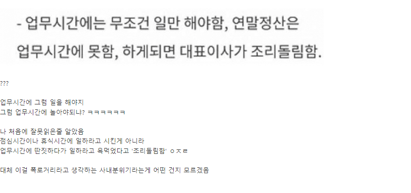 업무시간에는 무조건 일만해야한다. 이걸 잡플래닛에 불만이라고 저격한 근거입니다. 휴게시간에 일만하라 강요한것도 아니고 업무시간에 일하는 건 당연한것 아닌가요?