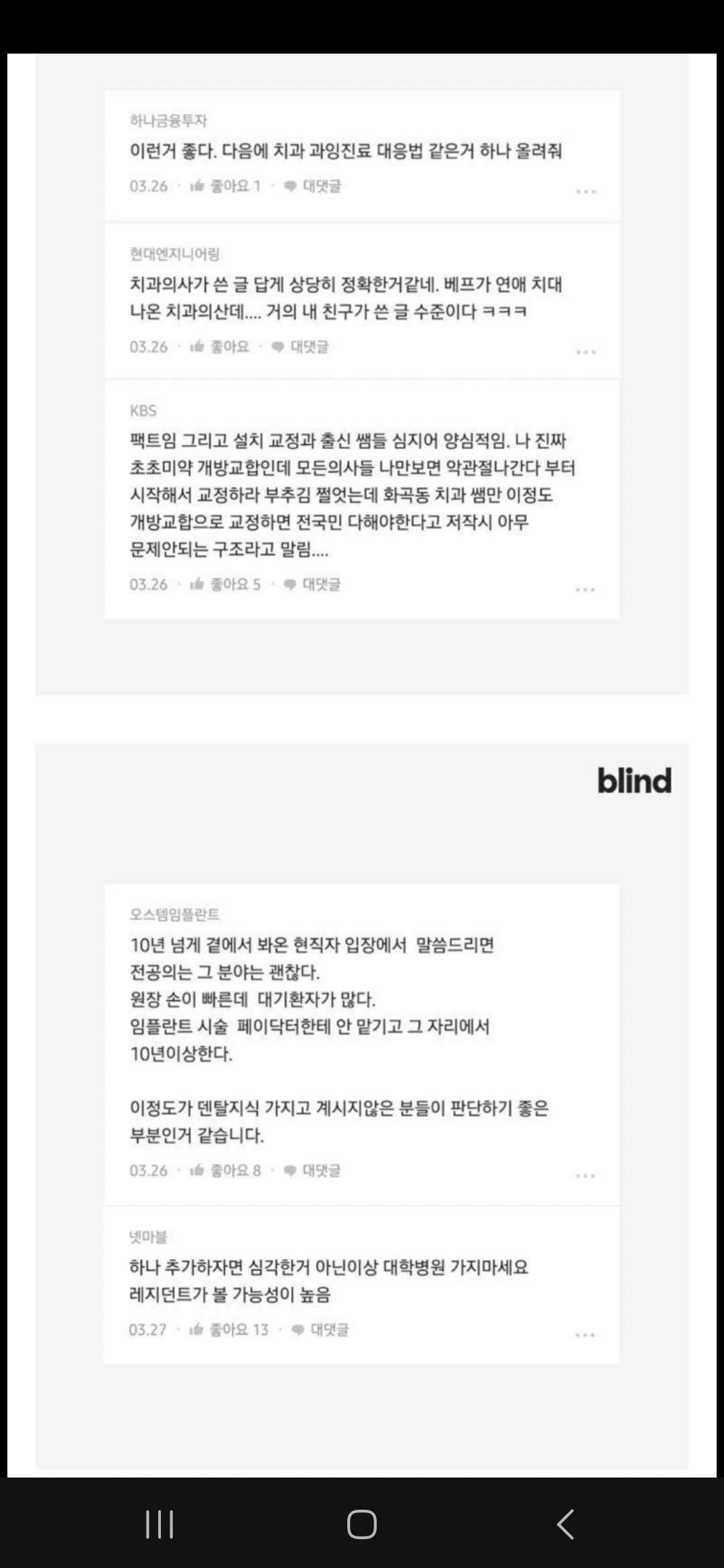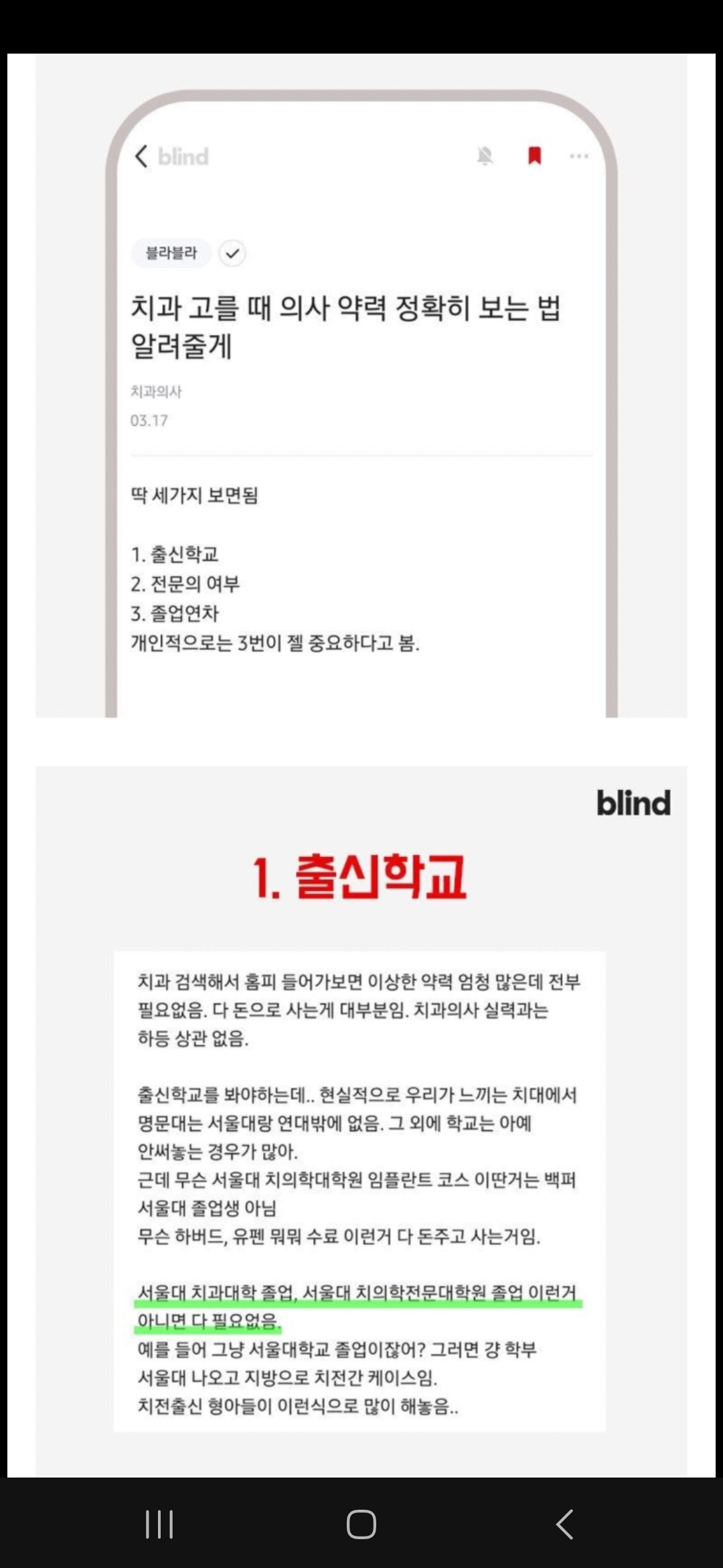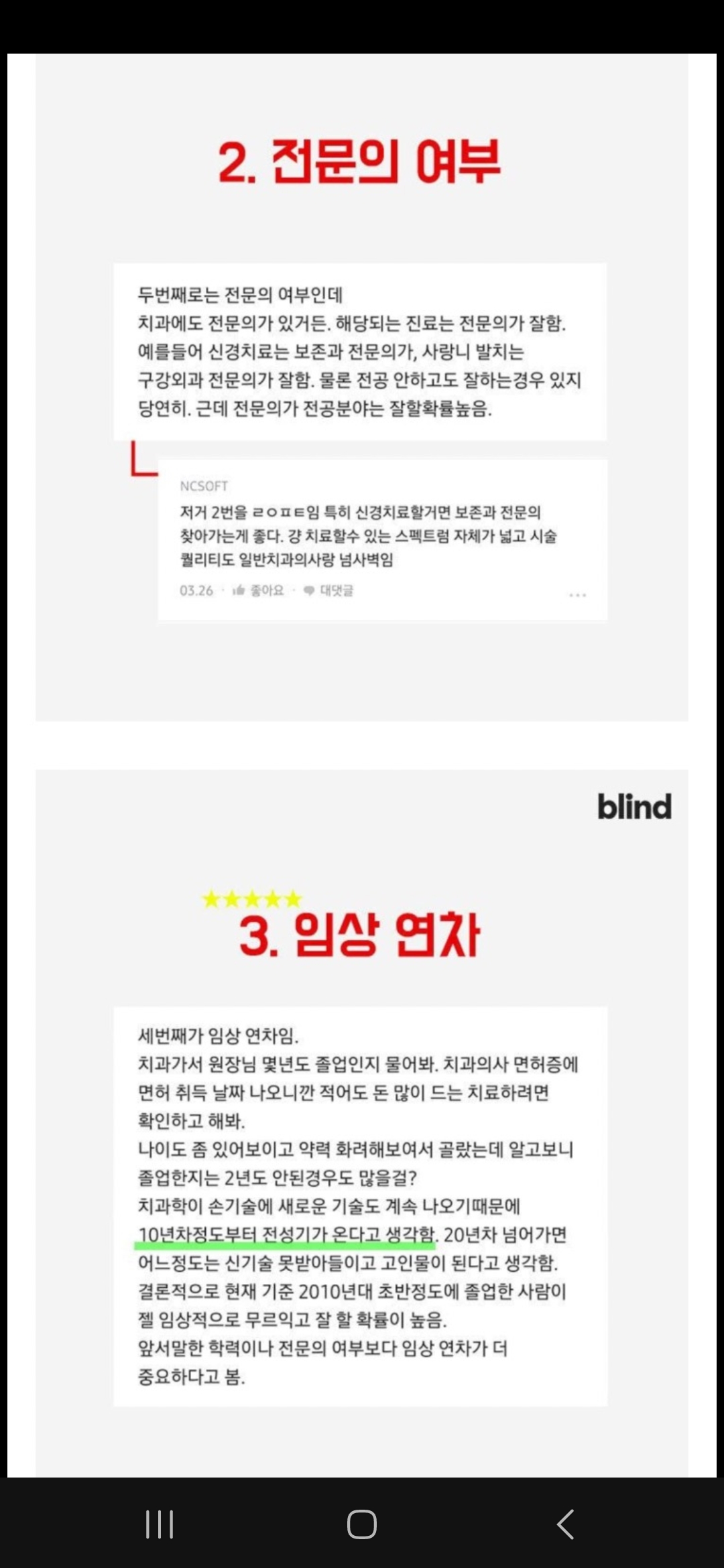 가장 중요한 부분입니다. 현직 치과의사들과 치위생사들도 한 목소리로 중요하다고 지적하는 부분이지요. 바로 경력입니다. 블라인드에서도 현직의사가 원장님 졸업 연도와 면허취득시기를 물어보네요. 서울대 치대를 졸업한 것보다, 임상경력 10년 이상인 의사가 진료 수준에서 따라올 수가 없다는 얘기입니다.