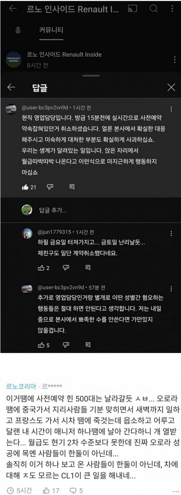 어떤 직원은 이 남성 집게손가락 혐오사태로 사전예약 물량 500대는 날라간 것으로 추정했습니다. 실제 영업사원도 사전예약 물량을 취소당했다고 블라인드를 통해 언급했습니다.