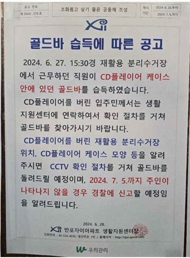 지난 6월 28일 서울 반포자이아파트 생활지원센터는 센터장 명의로 골드바 습득 공고를 했습니다.