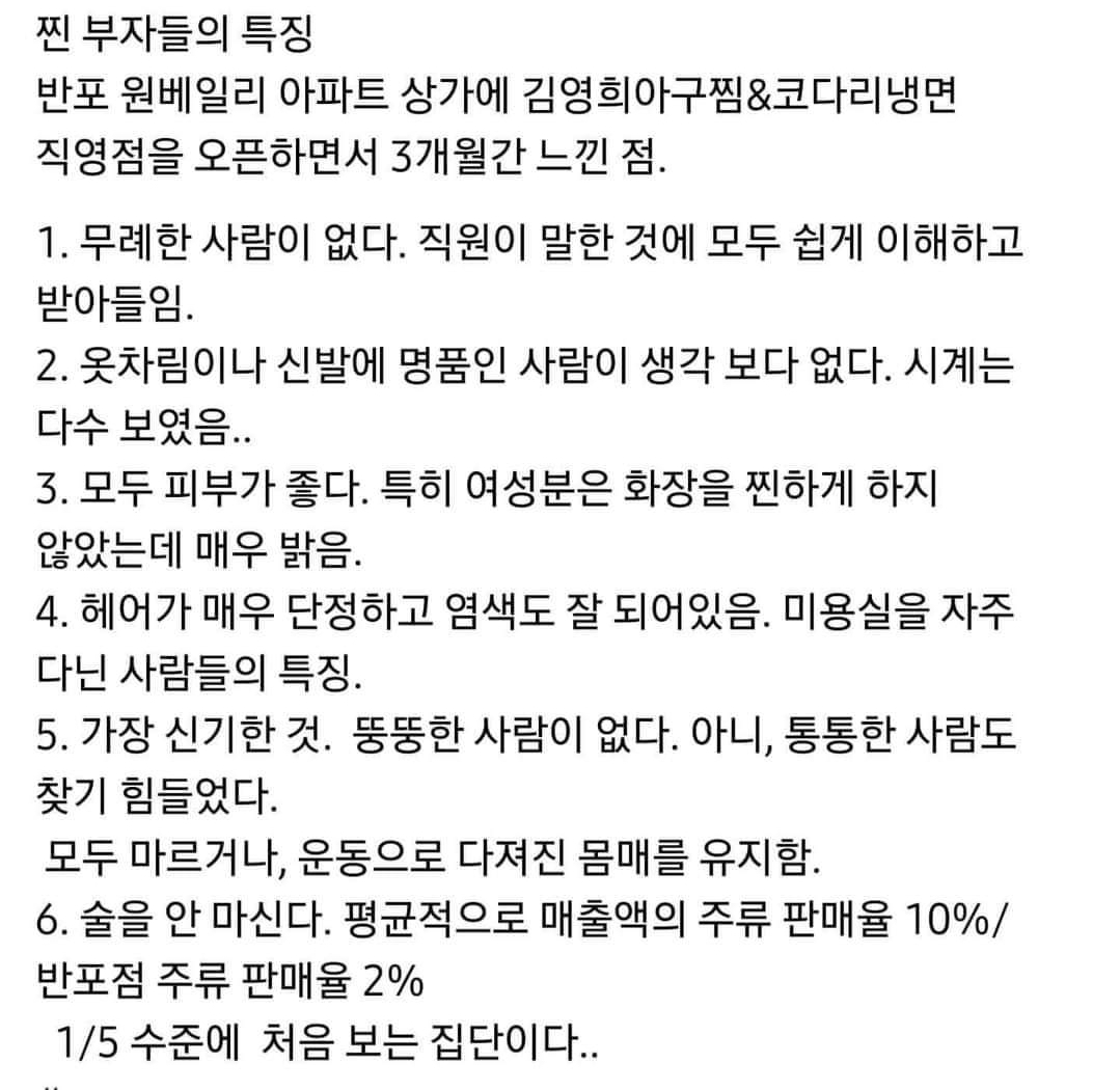 2번도 공감을한다고하네요 수수하다는건 다만 집앞이기 때문에 찐 부자들도 집 근처에 나올때 꾸미거나 할 이유가 없다고 합니다.