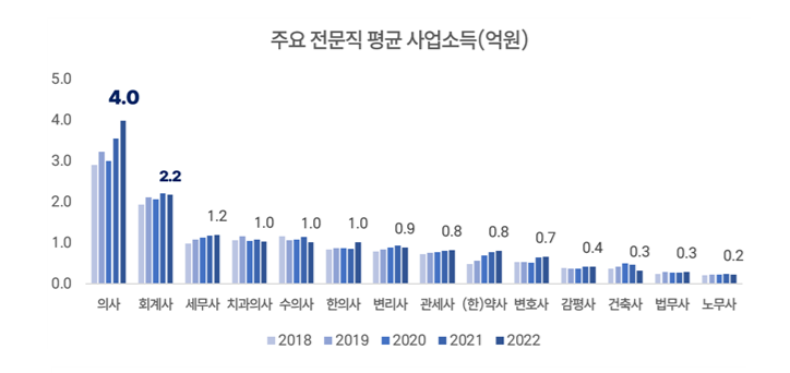 주요 전문직 중 평균소득은 의사(4억)에 이어 회계사(2.2억), 세무사(1.2억), 치과의사(1억), 수의사(1억), 한의사(1억), 변리사(9000만원), 관세사(8000만원), 약사(8000만원), 변호사(7000만원) 순으로 높았습니다. 1위인 의사의 평균소득이 2위인 회계사의 평균소득의 1.8배에 달하는 것으로 나타났습니다.