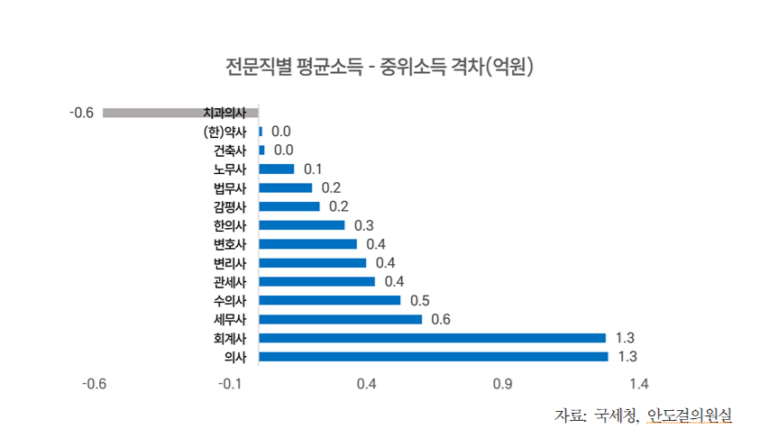 주요 전문직 중 중위소득은 의사(2.7억)에 이어 치과의사(1.6억), 회계사(9000만원), 약사(8000만원), 한의사(7000만원), 세무사(6000만원), 변리사(5000만원), 수의사(5000만원), 관세사(4000만원), 변호사(3000만원) 순으로 높았습니다. 1위인 의사의 중위소득이 2위인 치과의사의 중위소득의 1.4배에 달했습니다.
