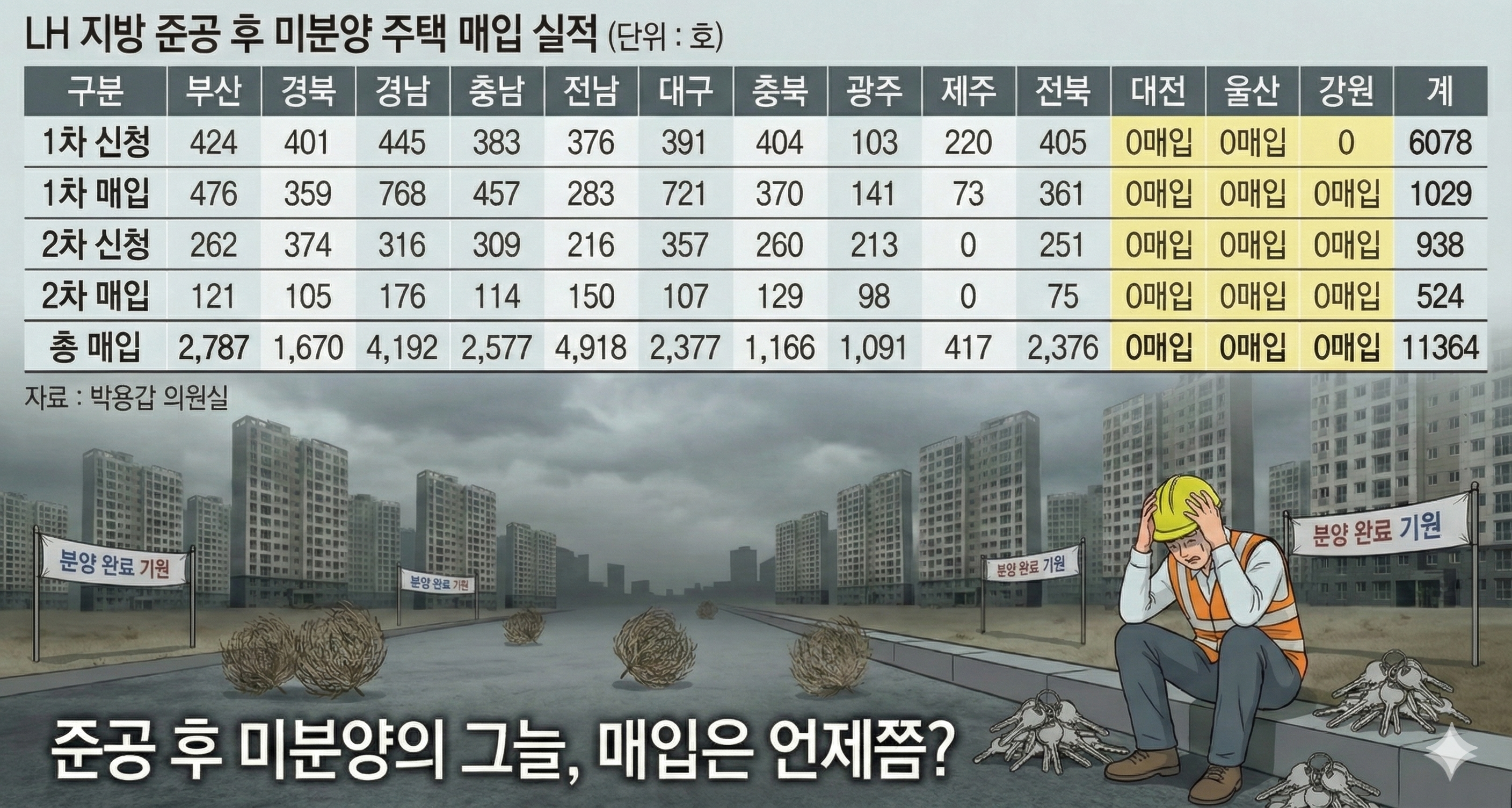 정부가 지방 건설경기 침체를 막기 위해 '구원투수'로 등판시켰던 LH의 매입 확약 정책, 과연 현장에서는 골고루 작동하고 있을까요? 국회 국토교통위원회 박용갑 의원(더불어민주당, 대전 중구)이 공개한 자료를 분석해 보니, 지역 간 온도 차가 생각보다 훨씬 심각합니다.