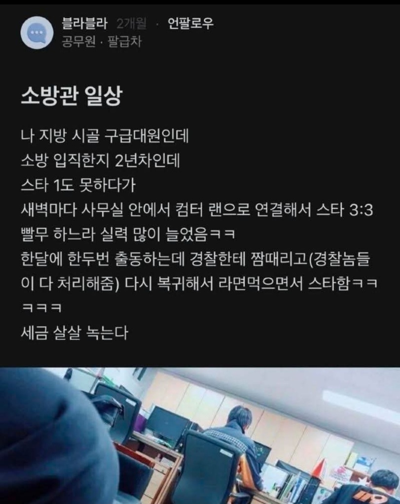 - 소방 업무의 특수성 (대기 시간): 소방관의 업무는 '화재/구조 상황 발생 시 즉각 대응'이 핵심입니다. 출동이 없는 대기 시간에는 다음 출동을 위해 체력을 비축하거나 장비를 정비하며 휴식을 취하는 것도 업무의 연장선으로 인정됩니다. 단순히 사무실에 앉아 있거나 게임을 하는 모습 자체가 곧바로 '직무 태만'으로 연결되는 것은 아닙니다. (물론, 글쓴이처럼 새벽 내내 게임만 하느라 업무에 지장을 주는 것은 문제입니다.)