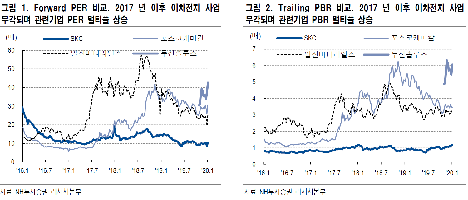 금융투자업계에선 SKC의 산업영역이 변화한 점을 고려하면 현재 주가가 상당히 저평가 인 것으로 해석했다. 황유식 NH투자증권 연구원은 "현 주가는 2020년 추정실적 기준 PER 10배, PBR 1.1배로 2차전지 소재 기업으로